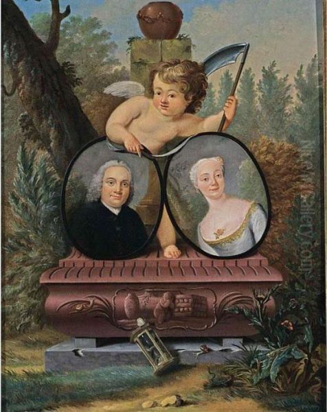 A 'memento Mori' Portrait: A Portrait Of A Gentleman, Bust Length, Wearing A Black Suit, And A Portrait Of His Wife, Bust Length, Wearing A Grey Silk Dress, Both In Painted Ovals, On A Red Stone Pedestal, Together With A Putto Holding A Scythe, An