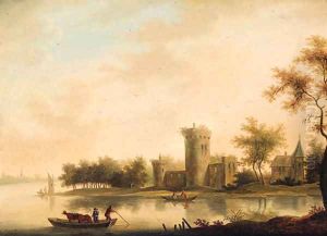A Coastal Inlet With Figures And A Horse Before A Tower, A Ferry Beyond