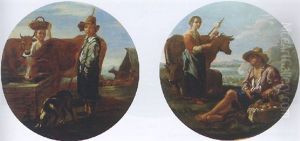Drover With A Cow, Goats And Sheep In An Italianate Landscape
