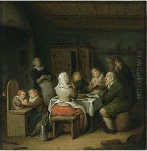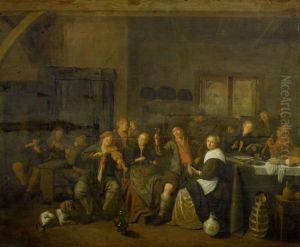 The Interior Of A Tavern With Peasants Cavorting And Drinking