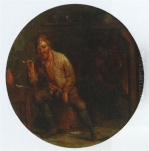Tavern Interior With Figures Resting By A Fire And Others Eating And Drinking