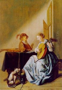 An Amourous Couple Before A Table And An Old Man Smoking A Pipe By A Hearth