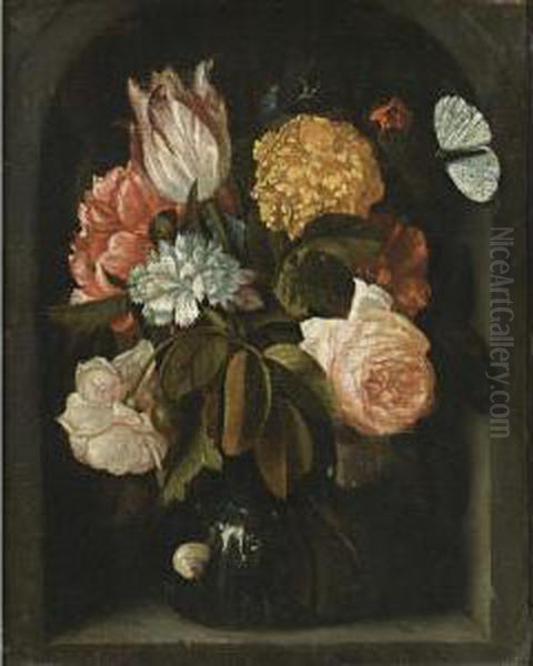 A Still Life With Roses, A Tulip, Carnations, A Peony And Other Flowers, All In A Glass Vase, With A Snail And A Butterfly, In A Stone Niche