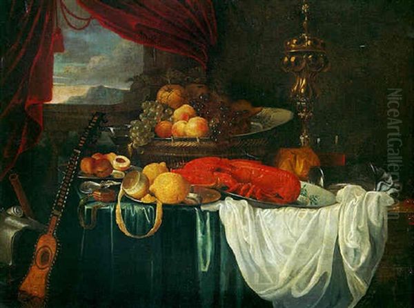 A 'pronk' Still Life With Grapes, Peaches And Pears On A Wan-li-dish On A Basket, A Lobster, On A Plate Lemon And Peaches In Pewter Plate On A Draped Table