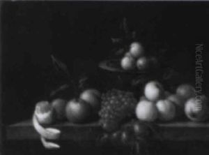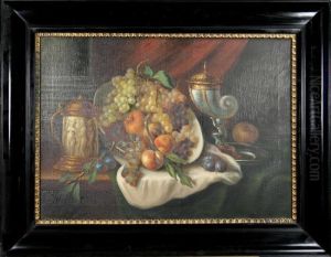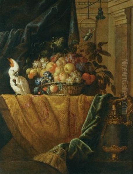A Still Life With A Basket Of Fruit And A Parakeet Upon A Ledge Draped With A Damask Beside An Ormolu Mounted Porphyry Vase