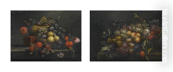 Still Life Of Grapes, Oranges, Figs, A Melon, Flowers And A Red Lacquer Box, All Upon A Stone Ledge; Still Life Of Pears, Grapes, Peaches, Figs, Flowers And A Woven Basket, All Upon A Stone Ledge (pair)