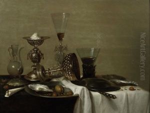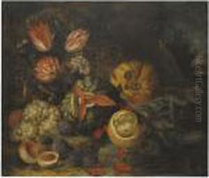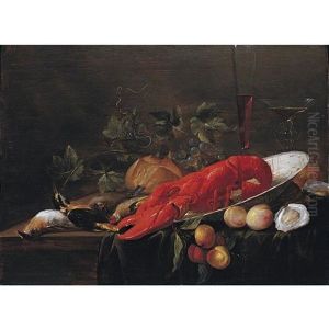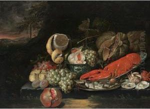 A Pewter Dish Of Oysters, Lobster And A Peeledlemon On A Draped Table With Grapes, Oranges And A