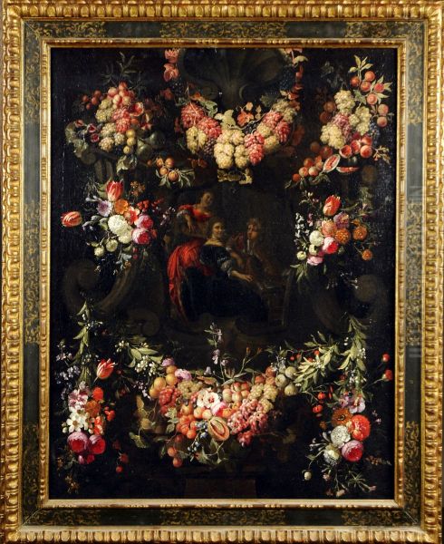 Scene Galante Entouree D'une Guirlande De Fleurs Et De Fruits