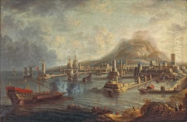 A Capriccio Of A Mediterranean Port With Shipsin A Busy Harbor