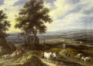 A Landscape With Figures On A Track By A Country House (+ A Mountainous River Landscape With Hunters By A Waterfall; Pair)