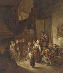 Peasants making merry in a barn