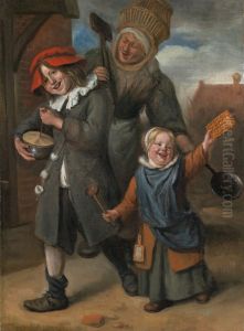 "oude Vrijer - Jonge Meid"; A Comical Figure Greeting A Young Woman In An Interior