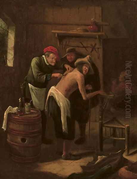 A quack operating on a peasant's back in an interior