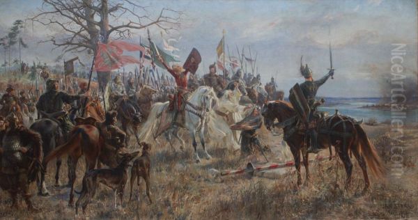 Bring the timeless beauty of Jan Styka's Vytautas' oath (Vytautas the Great, Grand Duke of Lithuania, swearing his revenge to the Teutonic Knights for the burned and ruined Kaunas Castle in 1362) into your home with a handmade oil painting reproduction. Carefully recreated on canvas by skilled artists using traditional techniques, this piece captures the delicate brushwork, subtle light, and vibrant color of the original masterpiece. With museum-level quality and rich texture, it brings elegance and artistic depth to any space. Enjoy free shipping and make this masterpiece a part of your personal collection.