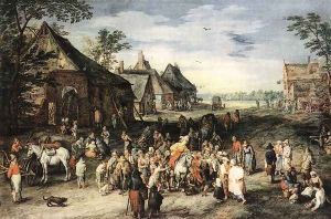 Travellers On A Country Road With A Village Beyond