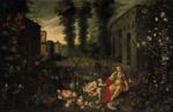 An Allegory Of Smell: A Putto Offering Flowers To A Nymph In The Garden Of A Palatial Mansion