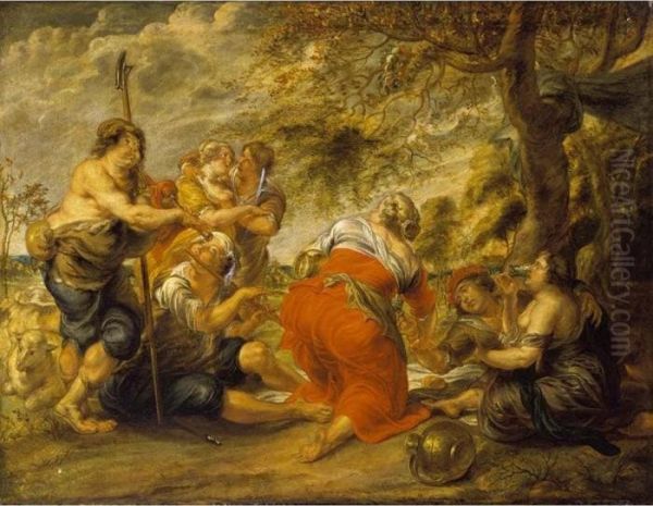 A Pastoral Landscape With Shepherds Drinking And Eating Under A Tree, Together With A Bagpipe Player And A Lute Player, A Flock Of Sheep Nearby