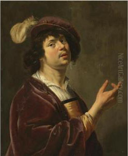 A Young Man, Half-length, Wearing A Burgundy Jacket And A Feathered Cap
