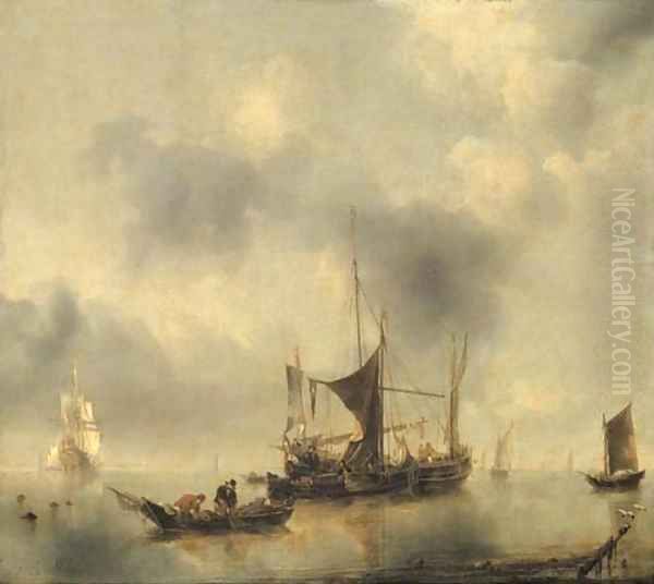 A kaag and a smak in a calm, with fishermen pulling in their catch from a rowing-boat in the foreground, a Dutch frigate and other boats beyond