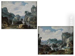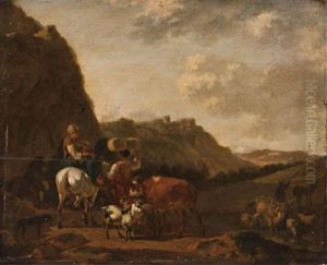Elegant Company Beside A Fountain And A Drover And His Cattle Beside A River, A Village Beyond