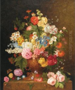 Roses And Other Flowers In A Terracotta Vase With A Bird's Nest On A Marble Ledge And; Fruit And Peonies In A Basket With Hazelnuts On A Marble Ledge