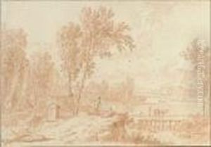 A Wooded, River Landscape With Shepherds And Their Flock, A Hilltop Town And Mountains Beyond