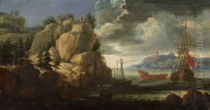 A Rugged Italianate Landscape, With Fishermen In The Foreground