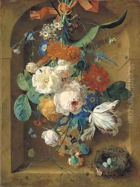 Bring the timeless beauty of Jan Van Huysum's A festoon of flowers hanging from a red ribbon in a stone niche with a bird's nest into your home with a handmade oil painting reproduction. Carefully recreated on canvas by skilled artists using traditional techniques, this piece captures the delicate brushwork, subtle light, and vibrant color of the original masterpiece. With museum-level quality and rich texture, it brings elegance and artistic depth to any space. Enjoy free shipping and make this masterpiece a part of your personal collection.