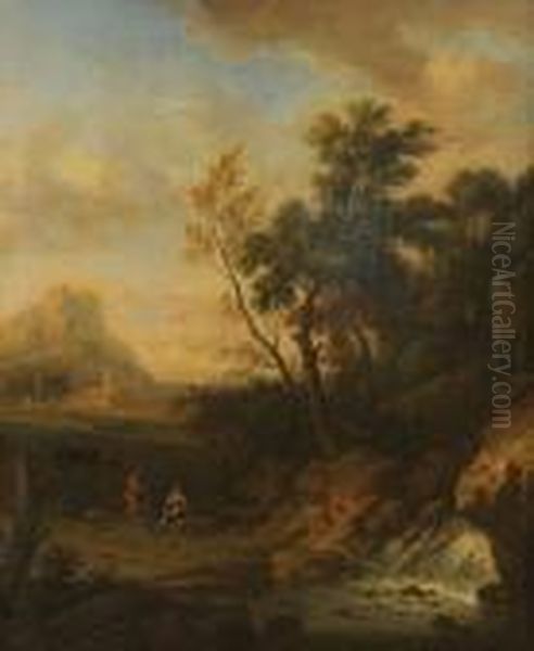 Arcadisch Landschap Met Reizigers Bij Waterval