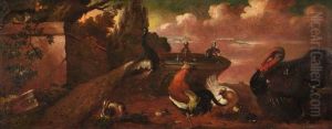 A Peacock, A Pheasant, A Parrot, A Cockatoo And Other Tropical Birds Assaulting A Crow In A Park Landscape; A Mallard And A Spaniel Besides A Lake In A Park Landscape