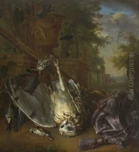 Still Life Of Game, Including A Hare, Grey Partridges, A Pigeon, A Musket, A Powder Bag, Trapping Nets And Summer Flowers Before A Stone Frieze, The Water Gardens Of A Villa Beyond