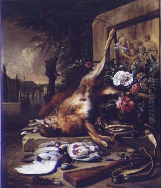 A Still Life Of Game, Including A Hare, Grey Partridges, A Pidgeon, A Musket, A Powder Bag, Trapping Nets And Summer Flowers Before A Stone Frieze, The Water Gardens Of A Villa Beyond