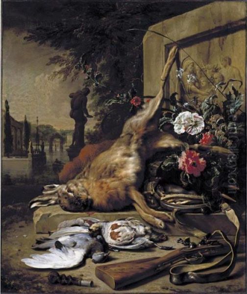 Still Life Of Game, Including A Hare, Grey Partridges, A Pigeon, A Musket, A Powder Bag, Trapping Nets And Summer Flowers Before A Stone Frieze, The Water Gardens Of A Villa Beyond