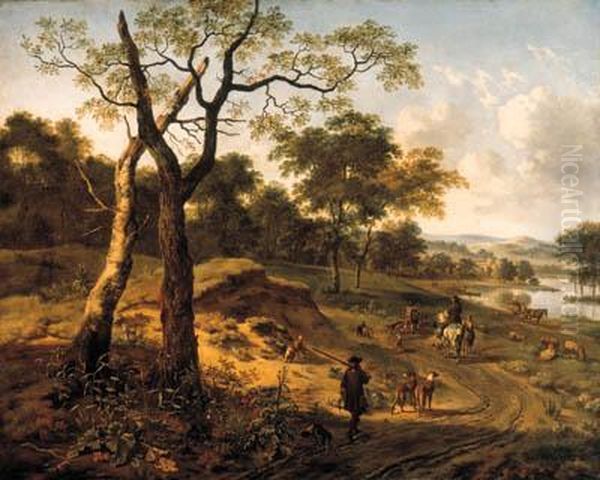 A Wooded Evening Landscape With A Hunter And His Dogs, Anotherhunter On Horseback Conversing With A Peasant, A Fishermen And Afalconer Carrying A Hoop Of Falcons On A Path, A Wagon And Otherfigures By A Lake Beyond