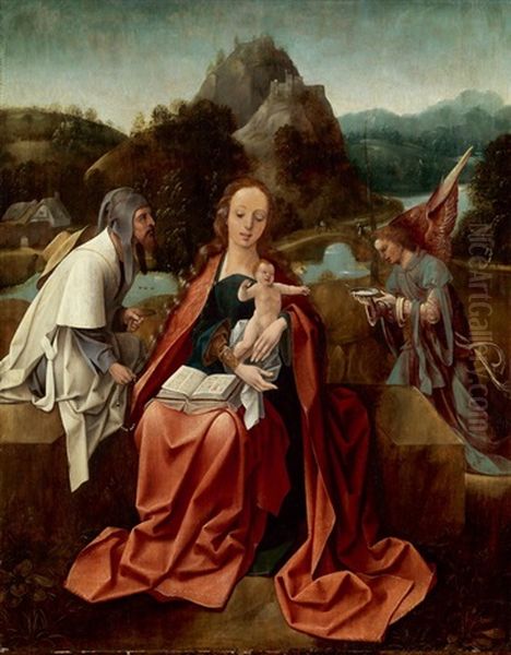 Madonna Mit Kind In Einer Landschaft Sitzend, Flankiert Von Engel Und Pilger