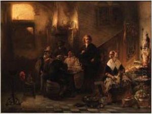 Figures Merrymaking In An Interior, A Woman Cooking At The Hearth