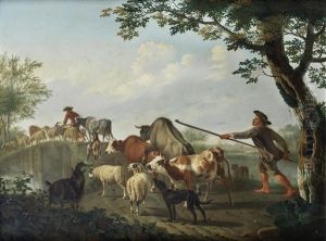 Drovers With Cattle, Sheep And Goats At A Woodland Pool