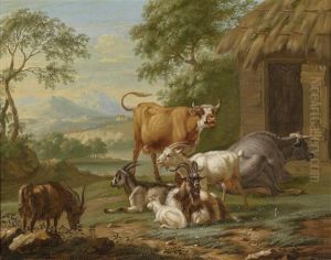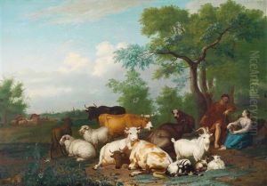 A Shepherd And A Milkmaid Conversing In A Landscape, Cattle, Goats, Sheep And A Sheepdog Resting Nearby