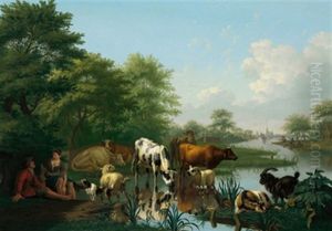 A Pastoral Landscape With A Herdsman Watering His Livestock, A Woman Milking A Cow And Other Cattle Beyond, A River Landscape And Town In The Distance