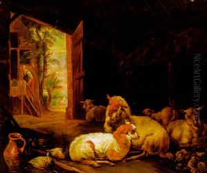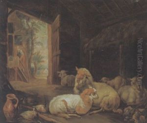 Sheep And Ducks In A Stable With A Maid Climbing The Stairs Of A Cottage And A Landscape Seen Through The Door Beyond