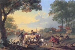 A Pastoral Landscape With A Cowherd And His Family Leading Their Livestock To A River Meadow With A Hamlet Beyond
