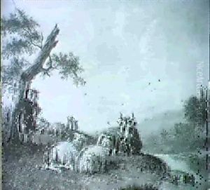 An Italianate River Landscape With A Shepherd And His Herd Near A Grotto, A View Of A Town Beyond