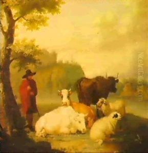 A Herdess And Her Cattle And Sheep In A Pastoral Landscape