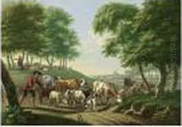 Herdsmen And Their Sheep, Goats And Cows In A Hilly Landscape, A Village With A Church Beyond