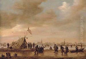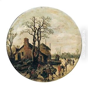 A Winter Landscape With Figures Skating On A Frozen River Before A Bridge, A Town Beyond