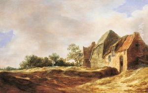 A dune landscape with peasants talking under a tree, an inn with travellers beyond
