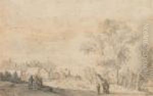 A River Landscape With Figures In A Horse-drawn Cart Crossing A Bridge, A Village With A Church Beyond