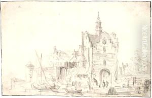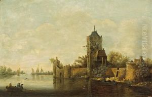 A River Landscape With Fishermen In Their Boats By A Ruined Tower, Shipping Beyond