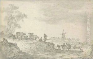A River Landscape With Fishermen Drawing In Their Nets And A Town Beyond