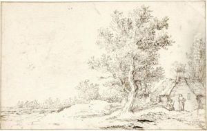 Kustenlandschaft Mit Ortschaft, Grossem Kirchturm, Windmuhlen Und Personenstaffage Im Vordergrund